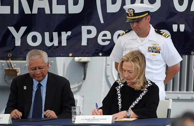 2011年11月16日,希拉里與時任菲外長羅薩里奧在“菲茨傑拉德號”驅逐艦上籤署聲明,紀念《美菲共同防禦條約》簽署60週年 圖自The Daily Signal