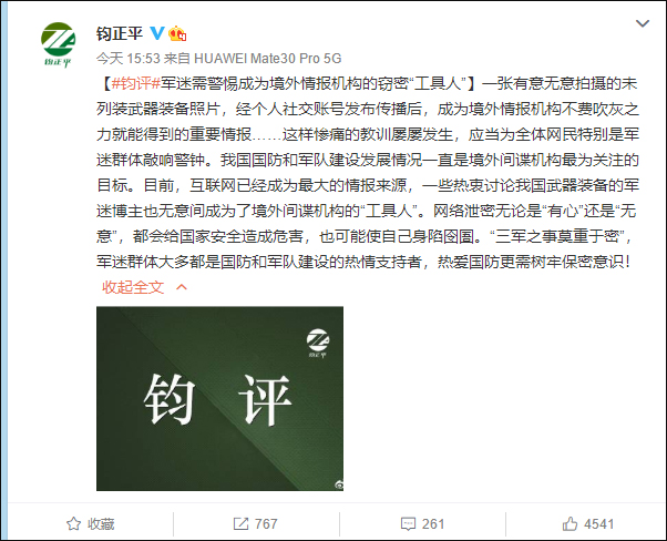 3月15日,解放軍媒體官方微博賬號“鈞正平工作室”(@鈞正平 )發佈評論稱,一張有意無意拍攝的未列裝武器裝備照片,經個人社交賬號發佈傳播後,成為境外情報機構不費吹灰之力就能得到的重要情報……這樣慘痛的教訓屢屢發生,應當為全體網民特別是軍迷羣體敲響警鐘。