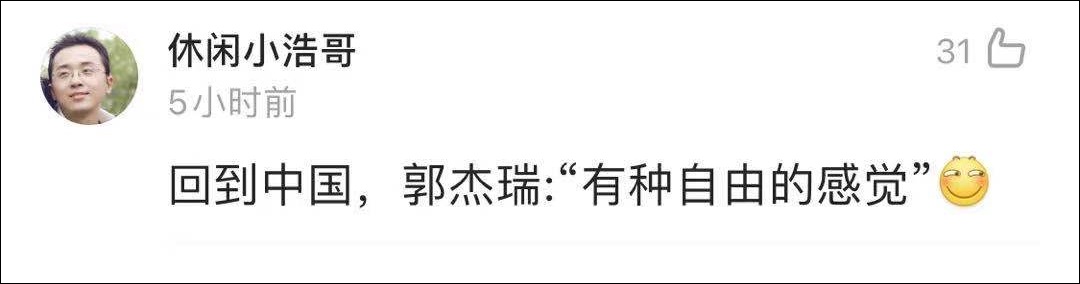 剛到上海機場,郭傑瑞就高興地説道:“我現在很開心,因為我感到一個有自由的感覺。(中國)沒有病毒,沒有反對戴口罩的人。”