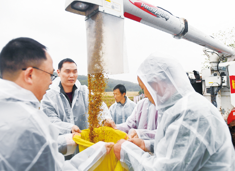 2020年11月2日,湖南衡南雙季晚稻試驗示範基地傳來消息:由袁隆平院士團隊培育的第三代雜交水稻“叁優一號”測產結果公佈,雙季畝產突破1500公斤。圖為當日工作人員將稻穀裝袋。 新華社記者 陳澤國/攝