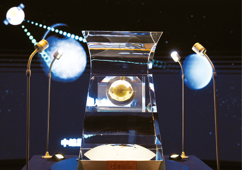 2020年12月17日,嫦娥五號返回器攜帶月球樣品安全着陸,中國探月工程“繞、落、回”三步走規劃如期完成,首次實現我國地外天體採樣返回。圖為2021年2月27日在中國國家博物館拍攝的月球樣品001號。 新華社記者 金良快/攝