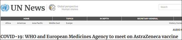 “世衞組織和歐洲藥品管理局將就阿斯利康疫苗問題會面”,聯合國網站報道截圖