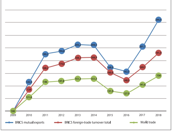 2018年,俄羅斯與金磚國家的貿易額超過1250億美元,比2017年增長22.4%。在世界經濟事務方面,俄羅斯同樣強調多邊原則,指出金磚國家的夥伴關係建立在遵守世界貿易組織所體現的多邊貿易體制規則和原則、承認多極世界秩序、照顧各國國家利益以及致力於與其他國家開展互利合作的基礎上。而這項戰略實施的目的是促進金磚國家的相互貿易和投資,為所有金磚國家的投資者和企業家創造一個有利於商業的環境,鼓勵市場之間進一步互動。