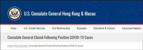 目前,美國駐港澳總領事館已關閉,以進行深度清潔和消毒,相應的密切接觸者追蹤工作已完成。
