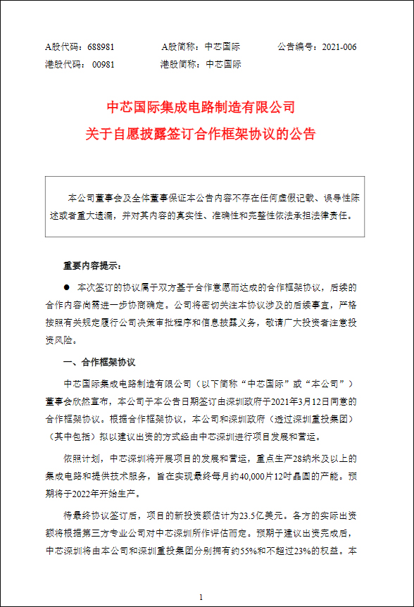 據上海證券交易所網站消息,3月17日,中芯國際集成電路製造有限公司發佈公告稱,該公司於3月17日簽訂由深圳政府於2021年3月12日同意的合作框架協議。根據合作框架協議,中芯國際和深圳政府擬以建議出資的方式經由中芯深圳進行項目發展和營運。