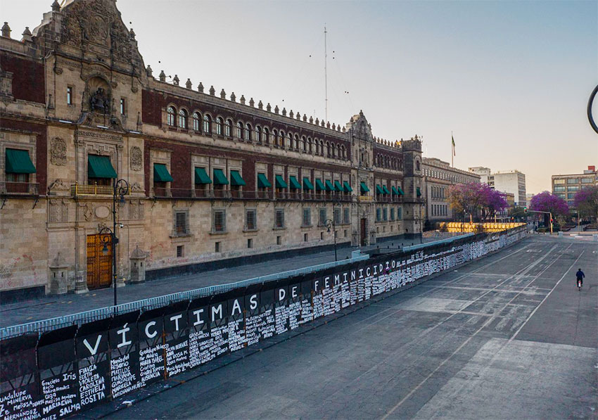 墨西哥抗議民眾在國家宮前的屏障上塗寫、投影抗議標語,將屏障變成了抗議地標,圖源:Mexico News Daily