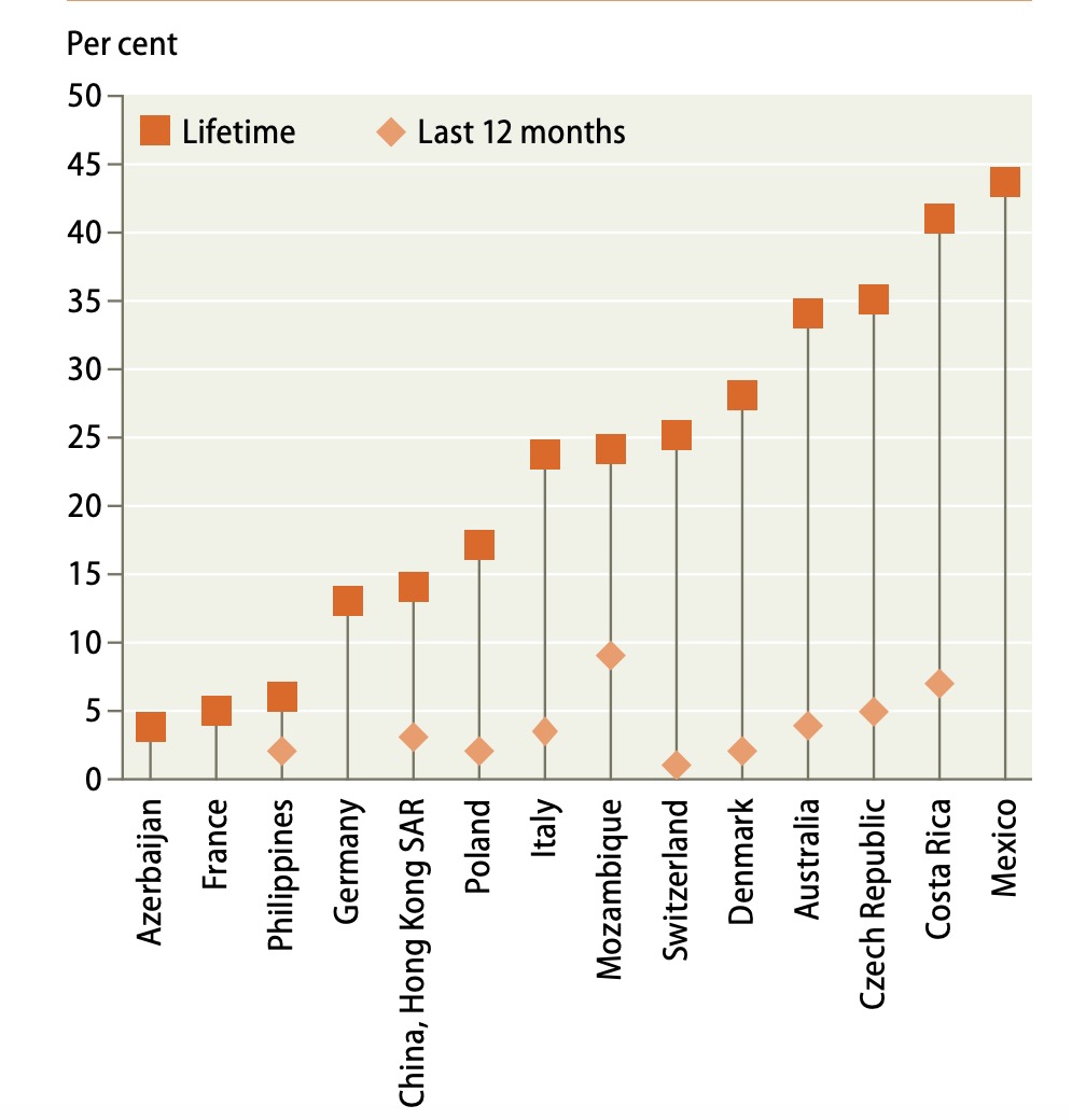 **相比於其它國家,過去20年來墨西哥女性的安全感無疑是最低的。**早在2010年,聯合國便在其關於針對女性暴力的報告中將墨西哥列為“對女性最暴力的國家之一”:在2002至2006年間,44%的墨西哥女性在其人生中和過去12個月至少遭到一次性暴力,其比例為全球最高。