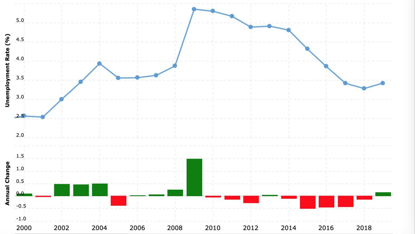 自2000年起,墨西哥失業率呈現不穩定上升,來源:World Bank/Macrotrends