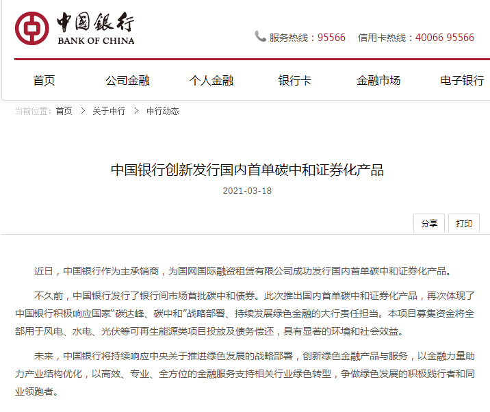 據中國銀行網站3月18日消息,近日,中國銀行作為主承銷商,為國網國際融資租賃有限公司成功發行國內首單碳中和證券化產品。