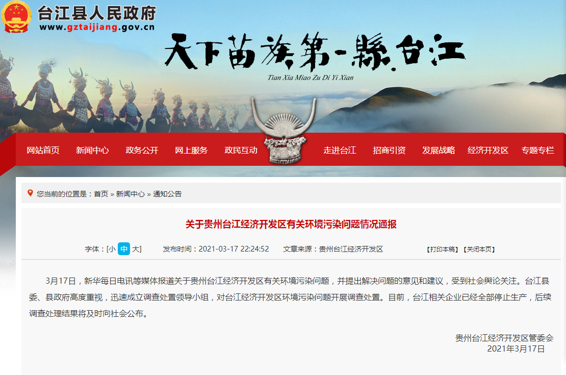 據貴州黔東南州台江縣政府網站3月17日消息,台江經濟開發區管委會當晚發佈《關於貴州台江經濟開發區有關環境污染問題情況通報》稱,3月17日,新華每日電訊等媒體報道關於貴州台江經濟開發區有關環境污染問題,並提出解決問題的意見和建議,受到社會輿論關注。台江縣委、縣政府高度重視,迅速成立調查處置領導小組,對台江經濟開發區環境污染問題開展調查處置。目前,台江相關企業已經全部停止生產,後續調查處理結果將及時向社會公佈。