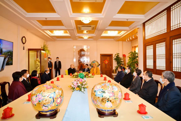 3月17日上午,柬埔寨國王諾羅敦·西哈莫尼一行參訪上海靜安寺,上海佛教協會會長、上海靜安寺住持慧明大和尚熱情接待參訪團。