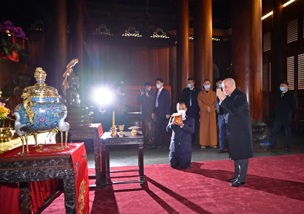 大雄寶殿內,西哈莫尼國王獻花敬香禮佛,並向靜安寺捐贈佛像一尊。
