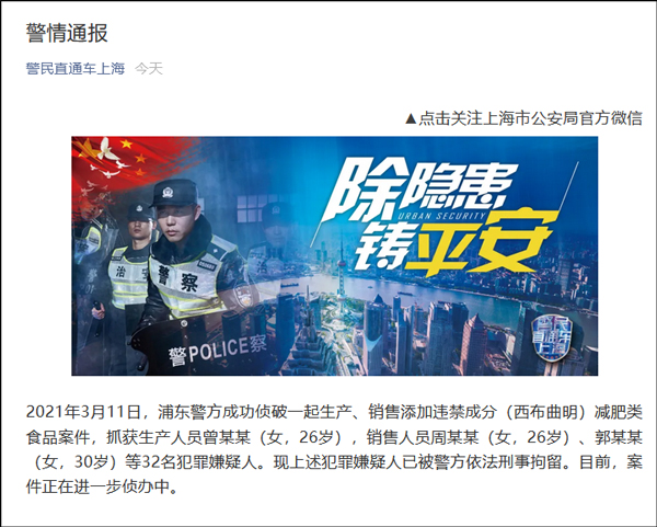 2021年3月11日,浦東警方成功偵破一起生產、銷售添加違禁成分(西布曲明)減肥類食品案件,抓獲生產人員26歲女子曾某某,及銷售人員26歲女子周某某、30歲女子郭某某等32名犯罪嫌疑人,均已被警方依法刑事拘留。