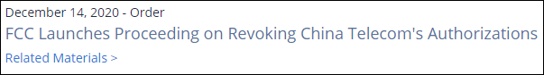 3月17日,FCC在其官網發佈了兩份新聞稿,其中內容大致相同,均聲稱:“提升國家安全是該委員會公共利益責任的組成部分,今天的行動旨在保護國家電信基礎設施免受潛在的安全威脅。”