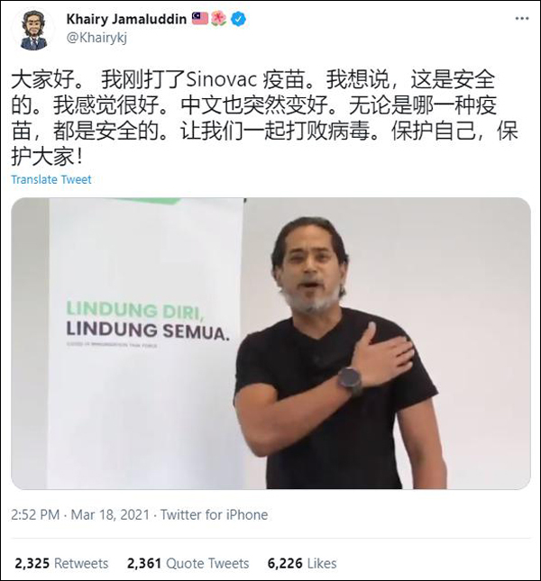 馬來西亞科學、工藝及創新部部長凱里·賈馬魯丁(Khairy Jamaluddin)在接種完中國科興生產的新冠疫苗後忍不住在推特上秀起了中文。