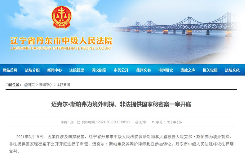 2021年3月19日,因案件涉及國家秘密,遼寧省丹東市中級人民法院依法對加拿大籍被告人邁克爾·斯帕弗為境外刺探、非法提供國家秘密案不公開開庭進行了審理。邁克爾·斯帕弗及其辯護律師到庭參加訴訟。丹東市中級人民法院將依法擇期宣判。