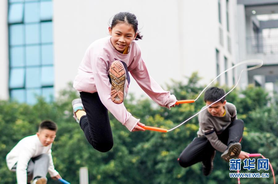 2020年12月9日,重慶市九龍坡區西彭鎮第一小學校跳繩隊隊員在進行花樣跳繩訓練。該校從1999年開始引進跳繩,開展特色體育活動。新華社記者 劉潺/攝