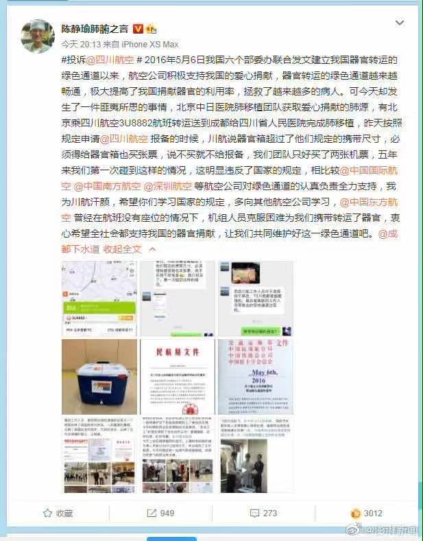 @四川觀察 3月20日消息,3月19日,微博認證為“無錫市人民醫院副院長”的用户發文稱,團隊在向四川航空報備需搭乘其航班轉運人體捐獻器官時,被告知器官箱超過規定攜帶尺寸,須給器官箱也買張機票。該用户稱,團隊最終只好買了兩張機票,“五年來第一次碰到這種情況”。
