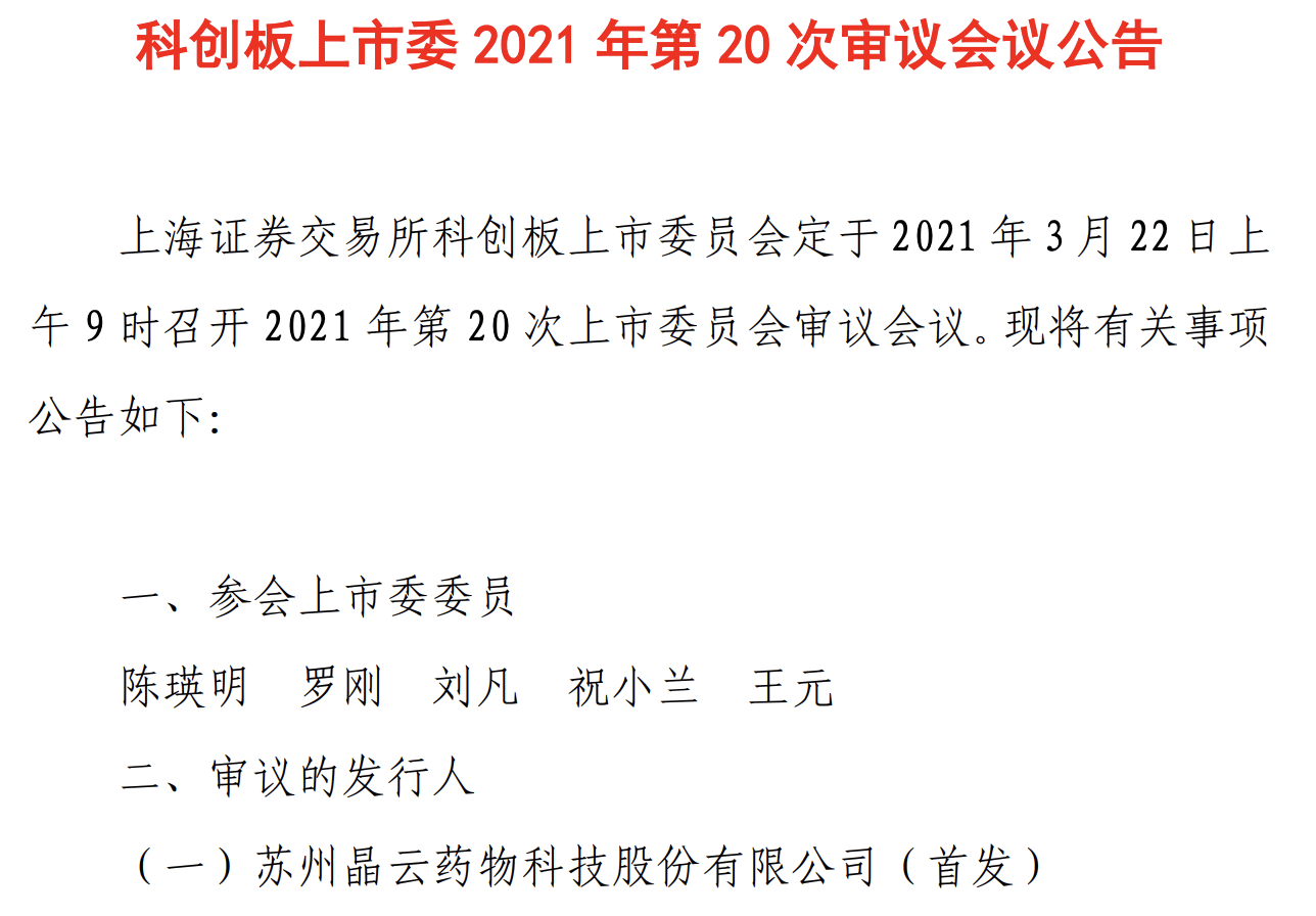 3月22日,上交所科創板上市委員會將召開2021年第20次上市委員會審議會議,蘇州晶雲藥物科技股份有限公司(下稱:晶雲藥物)等將上會接受審核。