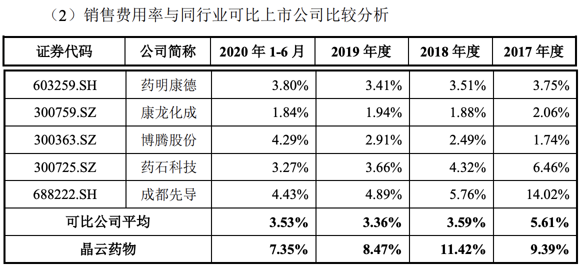 觀察者網注意到,2017年以來,晶雲藥物銷售費用率顯著高於同行業平均水平。