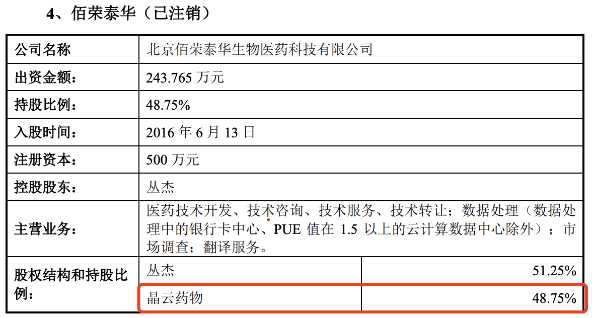 據介紹,晶雲藥物實際控制人之一陳敏華經同行介紹結識了佰榮泰華的創始人叢傑,後者當時正擬引入外部投資。