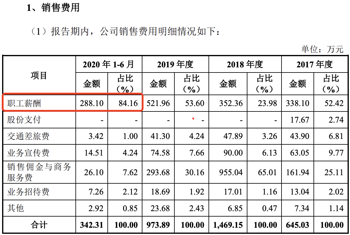 而截至同期末,該公司銷售人員11人,佔比6%。期內,銷售費用中職工薪酬總計288.1萬元,人均半年薪酬為26.20萬元。