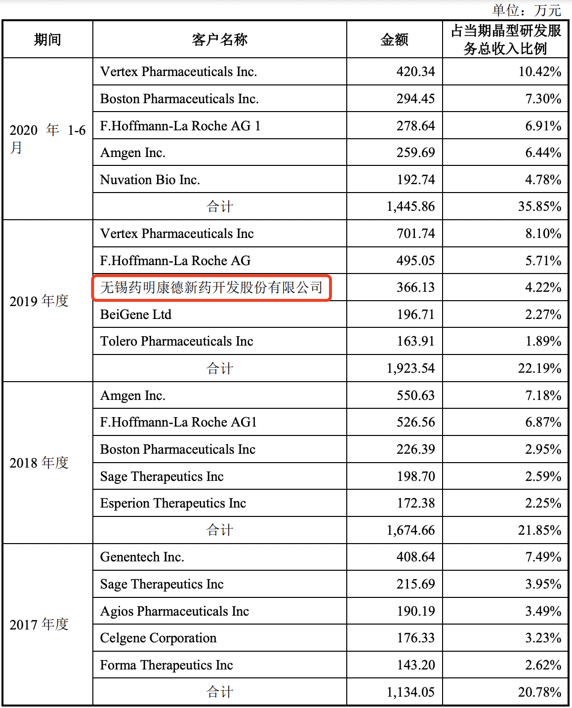 儘管晶雲藥物提到,其亦承接藥明康德等CRO公司的晶型研發服務,但觀察者網梳理其前五大客户時注意到,2017-2020年上半年期間,藥明康德僅在2019年突然新增為晶雲藥物“晶型研發服務”的第三大客户,當期金額366萬元,佔比僅4.22%。