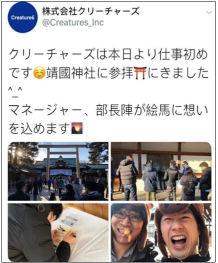 其實上述事件並非個案。同樣是知名娛樂產業人士,參與了寶可夢等知名IP製作的遊戲公司Creatures的高管,也在2019年的新年時“參拜”了靖國神社。