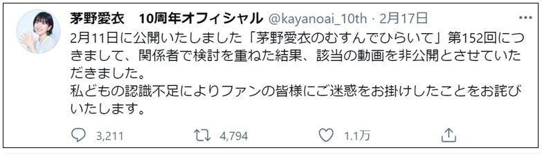 該回應稱,相關人員討論決定將當事內容進行非公開處理,並且就官方的認知不足而給粉絲帶來的困擾進行道歉。