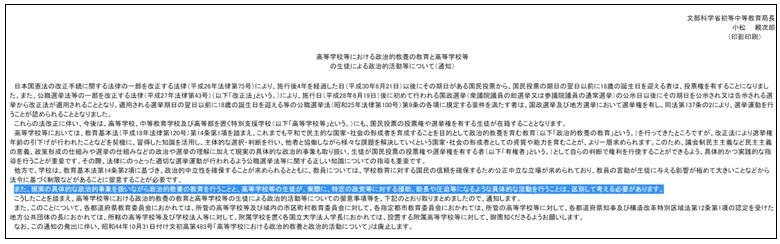 伴隨着修正法落地,日本的文部科學省,也就是教育部,出台了上面這個通知。其中特地強調,需要學校進行具體討論問題的政治實踐教育,這一點和支持政黨的行為需要區分開。