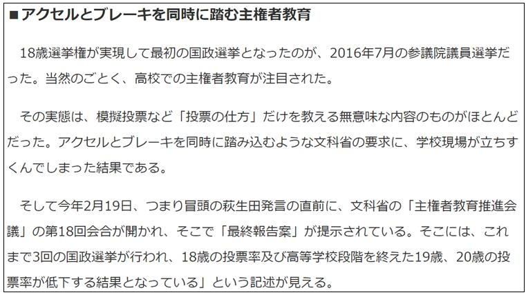 這意味着日本政府意識到了之前的“完全不碰政治”教育方針的侷限性,並且希望從這之後開始促進公民的政治意識培養。