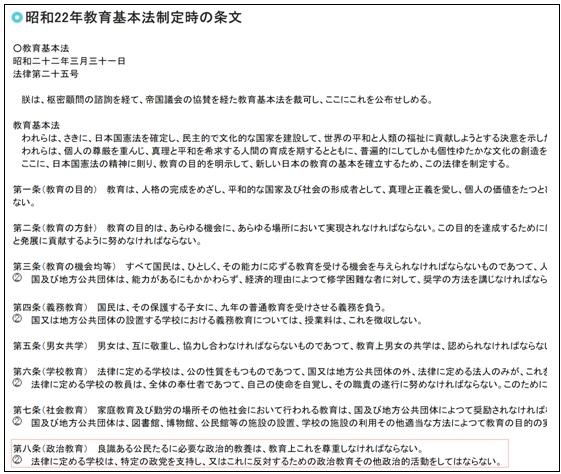 1947年,也就是昭和22年,在日本剛結束二戰的時候,頒佈的教育基本法裏有這麼一條,規定了學校教育禁止支持或者反對特定的政黨,以及其他的政治活動。