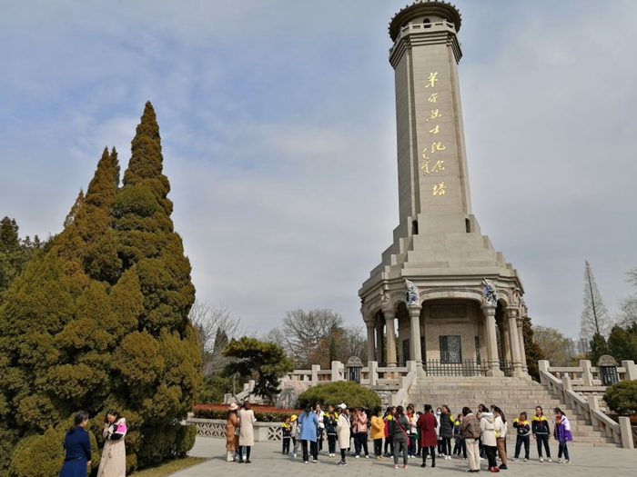 2021年3月18日,小小紅色講解員在位於烈士陵園中央的革命烈士紀念塔前,學生們在學習講解知識的同時也接受紅色教育。新華社記者楊文 攝