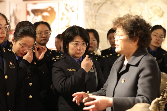 2021年3月5日,山東省臨沂市沂南縣綜合行政執法局女黨員聆聽於愛梅(右二)講紅嫂擁軍支前故事,很多黨員被感動流淚。杜昱葆 攝