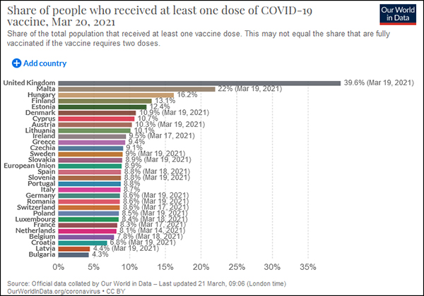 雙方的新冠疫苗接種進度也呈現巨大的差距。根據數據分析網站“Our World in Data”統計,截至3月19日英國新冠疫苗接種率已達到39.6%,居歐洲國家首位。而歐盟整體的疫苗接種率僅為8.8%,其中馬耳他的接種率最高,為21.7%。絕大多數歐盟成員國的接種率均在10%以下。