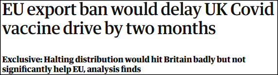 “歐盟出口禁令可致英國疫苗接種目標延遲兩個月”,《衞報》報道截圖