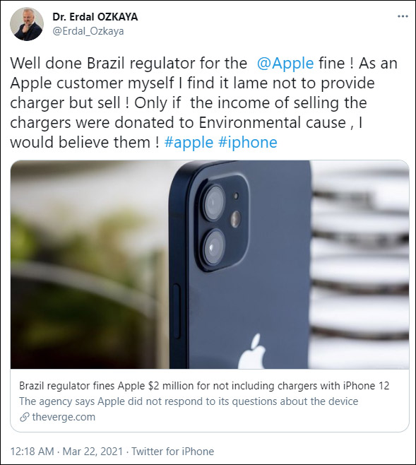 在巴西監管機構對蘋果做出處罰後,國外網友也紛紛表示支持。一位迪拜的網友對巴西的做法表示讚賞,他指出,只有蘋果將銷售充電器的收入全部捐贈給環保事業,他才會相信。