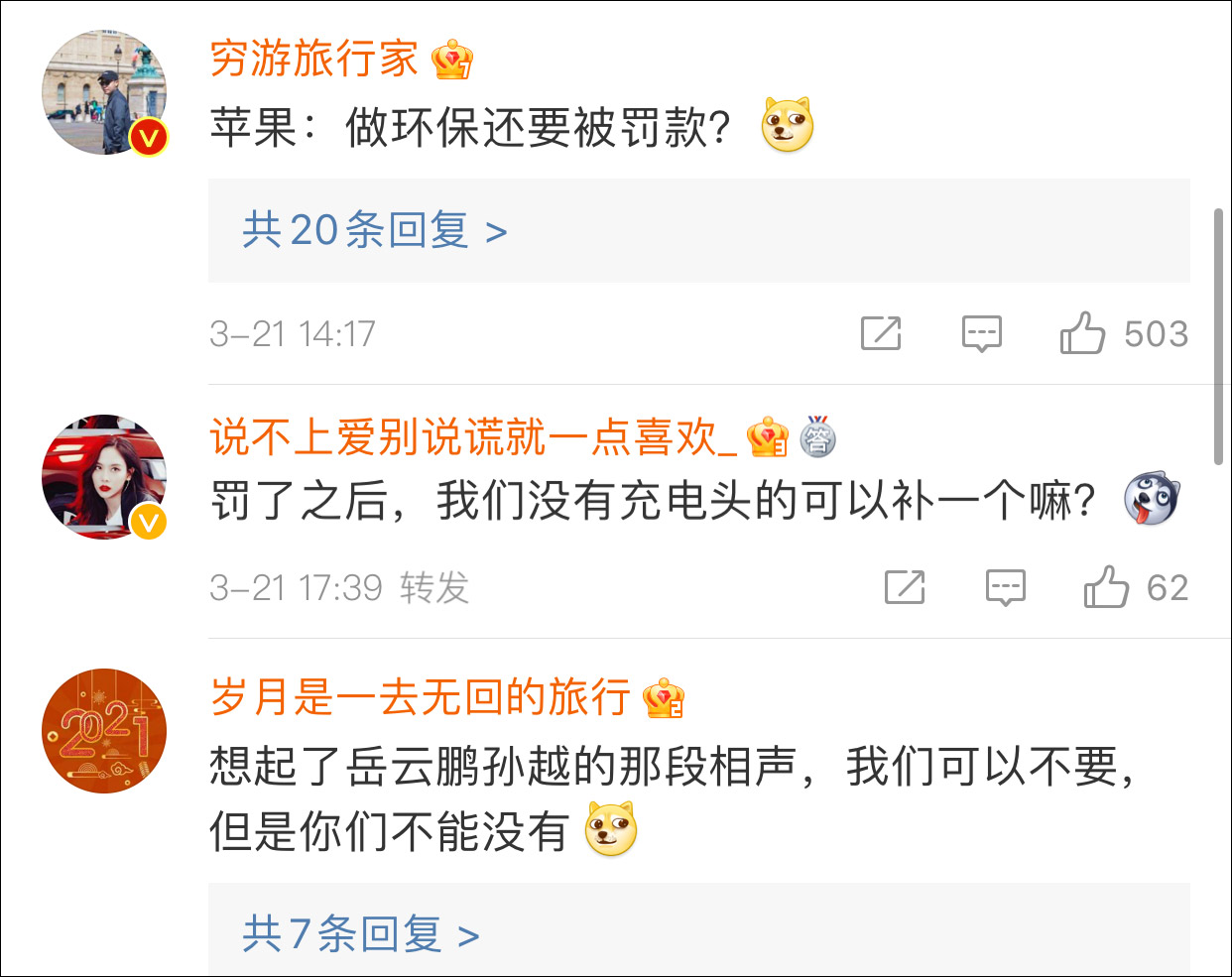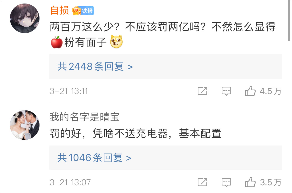 蘋果被罰款的消息迅速在微博上引發大量討論,有網友還@中國消費者協會。