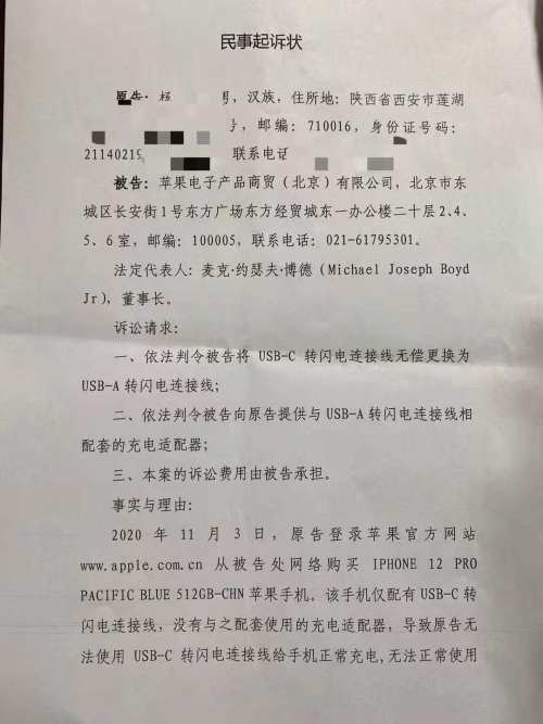 2020年11月26日,楊先生一紙訴狀將蘋果電子產品商貿(北京)有限公司起訴到西安市蓮湖區人民法院,提出兩點訴求:請求法院依法判令蘋果公司將USB-C轉閃電連接線無償更換為USB-A轉閃電連接線;依法判令蘋果提供與USB-A轉閃電連接線相配套的充電適配器。