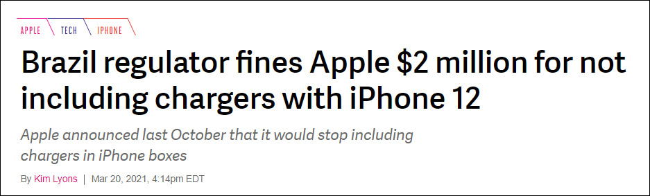 當地時間3月20日,據美國科技媒體“The Verge”報道,由於蘋果沒有在iPhone 12的銷售中附帶充電器,巴西聖保羅州的公共消費者保護機構Procon-SP對其開出200萬美元(約合人民幣1300萬元)的罰單。