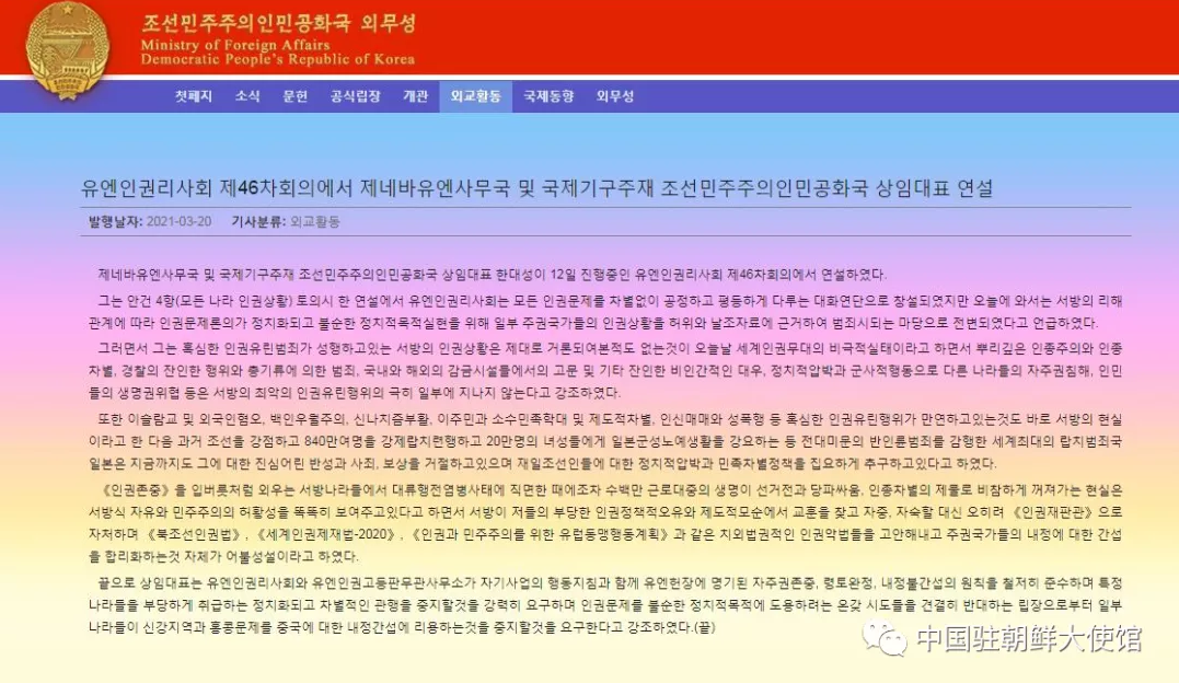 據中國駐朝鮮大使館微信公眾號3月22日消息,3月20日,朝鮮外務省網站刊文介紹了朝鮮常駐聯合國日內瓦辦事處代表日前在聯合國人權理事會第46次會議上的發言情況。