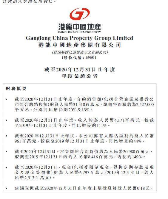 3月21日,港龍中國地產集團有限公司發佈2020年度業績。