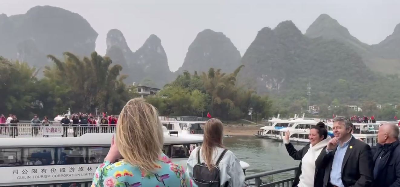 根據俄羅斯外交部22日在俄社交網站VK上發佈的視頻顯示,拉夫羅夫一行人在桂林的遊船上向其他遊客揮手,遠處是美麗的羣山。