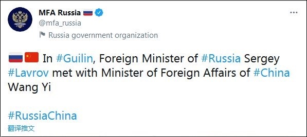(觀察者網 訊)俄羅斯外長拉夫羅夫3月22日至23日對中國進行訪問。拉夫羅夫的專機今天(22日)在桂林降落,據俄羅斯外交部官方推特消息,拉夫羅夫與中國國務委員兼外交部長王毅在桂林會面。