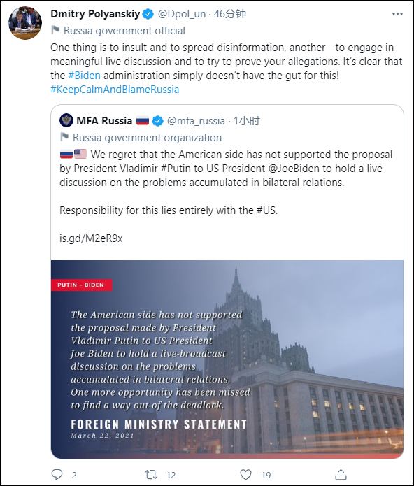 對於拜登和美方拒絕普京提出的“對線提議”,當地時間3月22日,俄羅斯常駐聯合國副代表德米特里·波蘭斯基(Dmitry Polyanskiy)轉發了俄外交部的聲明推文,並寫道:“一件事是侮辱(對方)和散佈謠言,另一件事則是參與有意義的現場討論,並試圖證明你的指控。很明顯,拜登政府根本沒有這個膽量!”