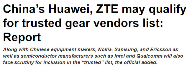 不過,印度《鑄幣報》3月22日援引一位匿名印度官員的話報道稱,只要華為、中興符合印度電信部門正在制定的標準,也可進入“可信任”的電信設備製造商清單,進而會被允許參與印度5G網絡建設。