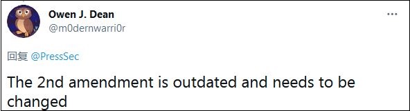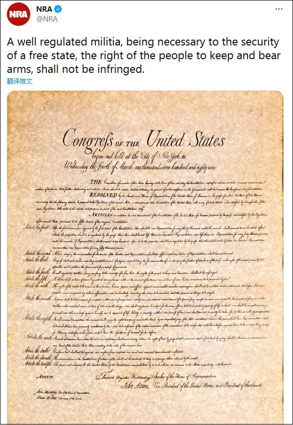 這條推特寫道:“管制良好的民兵是保障自由國家安全所必需的,因此人民持有和攜帶武器的權利不得侵犯。”這句話,正是第二修正案的內容之一。