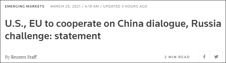 2020年10月,時任美國國務卿蓬佩奧與歐盟外交和安全政策高級代表博雷利通過電話會晤,其間啓動了美歐有關中國的新雙邊對話。但在拜登政府上台後,這一對話失去了動力。