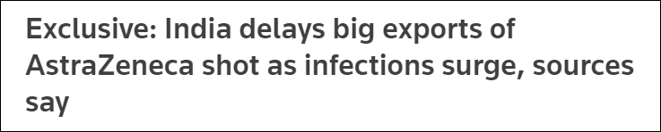 “所有(出口)安排都必須退居其次,至少是暫時……直到印度的疫情穩定下來之前,不會有任何出口。面對國內龐大的接種需求,(印度)政府不會冒這樣大的風險(出口)。”知情人士説。