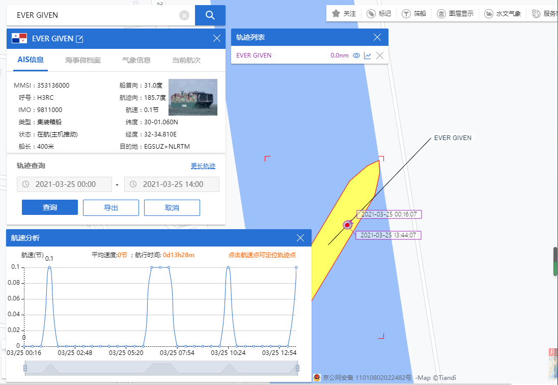 (觀察者網訊)3月25日中午,有媒體援引據美國消費者新聞與商業頻道(CNBC)的最新報道稱,“擱淺台灣貨輪開始移動蘇伊士運河交通即將恢復”。但經觀察者網在船舶跟蹤網站“船訊網”查詢,擱淺在蘇伊士運河上的台灣貨輪“長賜號”(Ever Given)從事故發生至今日14時並未移動,航跡未發生變化。